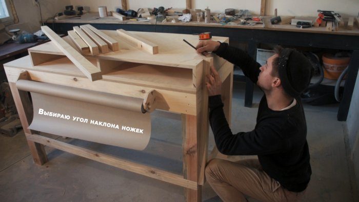 Перед запилом ножек, визуально примерил угол наклона и на каретке с проставкой, чтобы сохранить угол, отпилил ножки и царги.