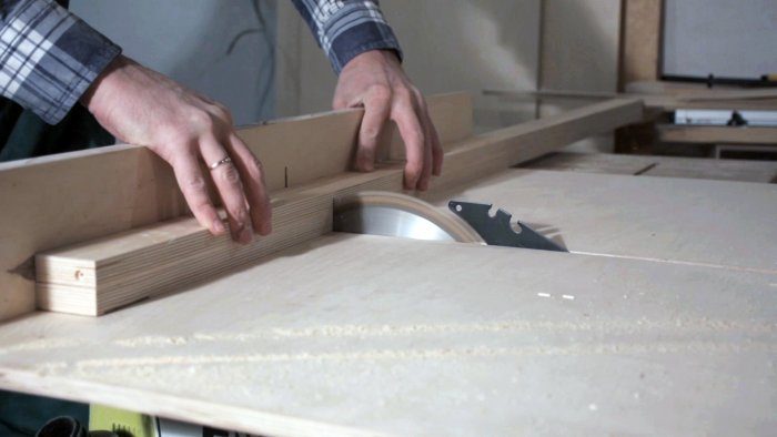 Для подстолья использовал туже 18 мм фанеру. Распустил ее на полосы шириной 50 мм на ножки и шириной 40 мм на царги. Склеил полосы попарно чтобы в итоге получить толщину в 36 мм.
