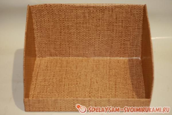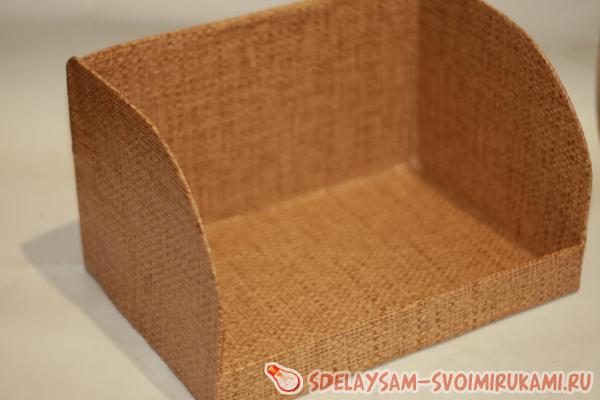 Приступаем к завершающему этапу работы. К задней стенке приклеиваем салфетку таким образом, чтобы она плавно ложилась на боковые части нашей хлебницы, тканью вниз. На этом этапе вы поймете, почему хлебницу нужно сделать на пару сантиметров меньше по ширине, чем салфетка. Наша хлебница почти готова.
