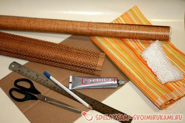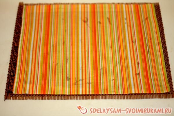 Теперь наша хлебница приобрела более привлекательный вид, к тому же она стала гораздо прочнее. Приступим к обработке бамбуковой салфетки. Мне необходимо разрезать ее на 2 части, одна из которых бут равна высоте передней маленькой стенки, т.е. 3,5см.