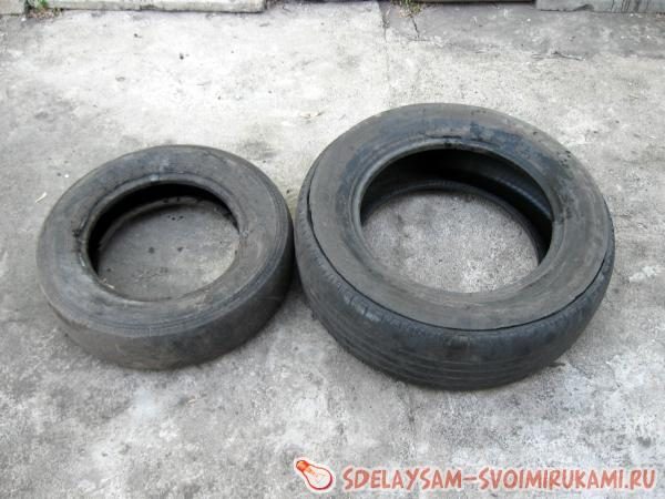 Для изготовления этой клумбы нам потребуется две покрышки. Одна из них должна быть меньше. Такие старые покрышки можно бесплатно попросить в любой шиномонтажной мастерской.