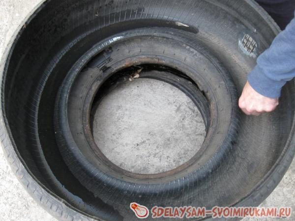 Как показано на иллюстрации боковую часть шины, необходимо срезать. Это можно сделать при помощи обычного сапожного ножа. В итоге у нас получается три элемента.