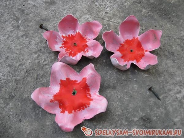 После того, как чашка готова, мы приступаем к ее украшению. Для этого нам потребуется 3 или более пластиковых бутылок, а именно их нижняя часть. Обрезать основу бутылок можно при помощи строительного ножа и ножниц. Таким образом, у нас получатся цветки, которые можно покрасить в любой понравившейся вам цвет. При помощи одного самореза необходимо прикрутить цветки на верхнюю часть чашки.