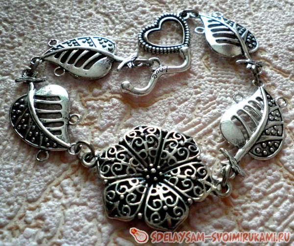 Идея этого браслета возникла при просмотре новинок товара в магазине, где я натолкнулась на симпатичные ажурные конекторы в виде цветка и листочков.