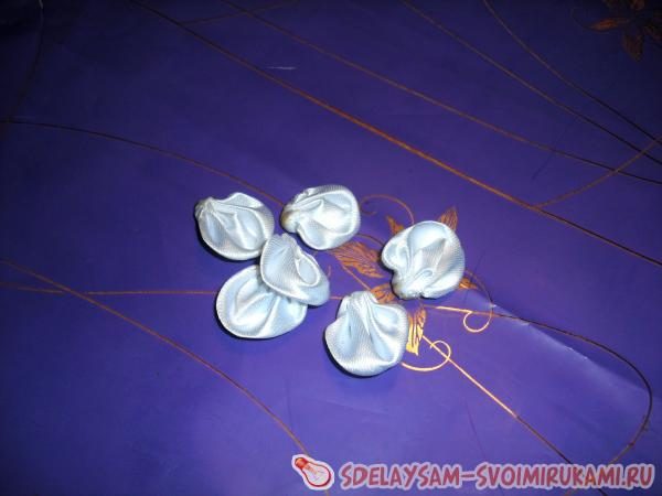 С нижней части цветка следует приклеить две детали их ленты белого цвета, которые будут полностью закрывать места крепления лепестков.