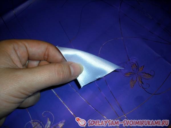 Придерживая вместе обе детали треугольники нужно сложить пополам, закрывая во внутренней части малиновую ленту.
