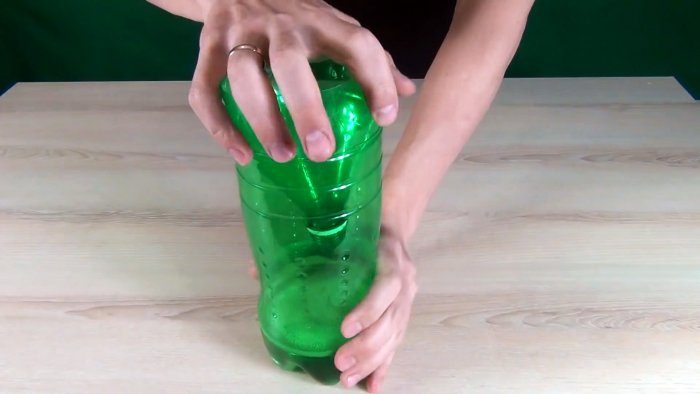 Затем в срезанную бутылку вставляется перевернутая горловина, расположенная как воронка. Она не должна достать до воды с дрожжами.