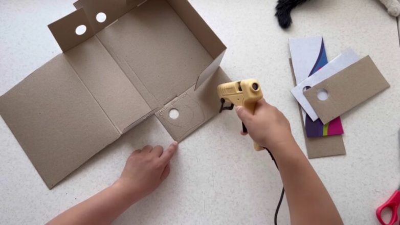 Срежьте выступающие части крышки картонной коробки. Если боковые стенки коробки многослойные, удалите второй слой картона для облегчения конструкции. Подклейте конструкцию, чтобы она была крепкой и надежной.