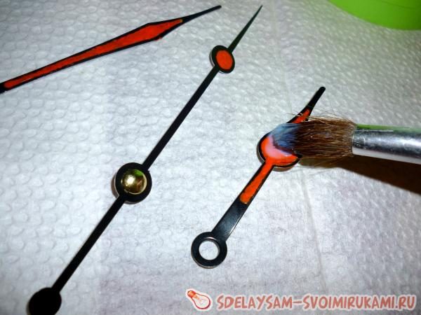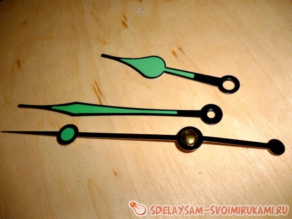 Так как при покупке часового механизма стрелок нужного цвета не оказалось, то я просто приобрела самые дешевые, они оказались зеленого цвета.