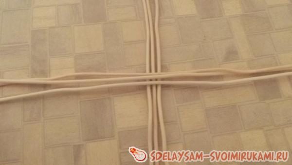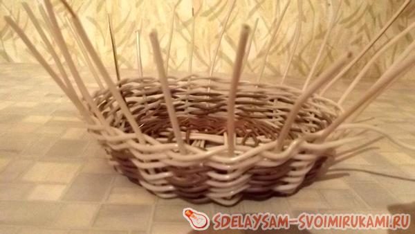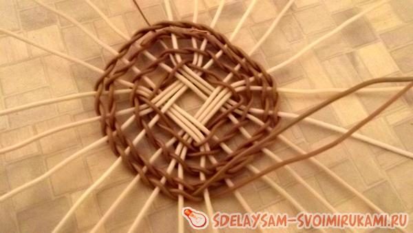 При помощи кусачек отрезается 12 одинаковых кусочков белой проволоки по 50 см. Отрезки делятся на четыре пучка по три проволочки в каждом. Пучки складываются в виде квадрата, как показано на фото. Далее проволоку коричневого цвета сгибают пополам и получившуюся петлю надевают на один из пучков основы. Петля затягивается, а рабочие коричневые концы перекрещиваются и захватывают следующий пучок. Так перетягивается весь квадрат, далее белые проволочки основы раздвигаются из пучков в стороны и заплетаются по отдельности. Плетется 7 рядов восьмерочным плетением. Для перехода к работе над стенками изделия, ветви основы сгибаются под тупым углом к донышку. Плетение продолжается еще на 4 ряда вверх. Выполнив достаточную высоту, остатки проволочные загибаются и прячутся внутрь, концы зажимаются плоскогубцами. Оставшиеся ветви основы закругляются дугой и вставляются в основание каждой второй проволочки. Выполнив ажурный верх, откусить все торчащие концы проволоки.