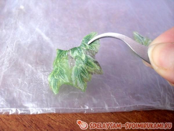 Пинцетом поддеваем мотив и кладем лицевой стороной вверх на выбранное на вазе место приклейки.