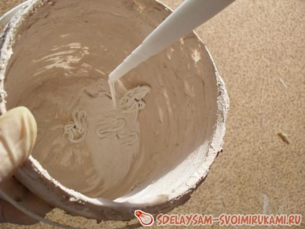 На заднюю поверхность фигурок наносим «жидкие гвозди» и клеим их на вазу.