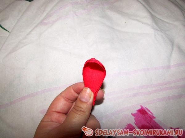 Берем скрученный лепесток и складываем его пополам, по месту скручивания. При этом пальцами рук делаем в середине лепестка углубление. Таким образом, чтобы получился лепесток с выемкой внутрь.