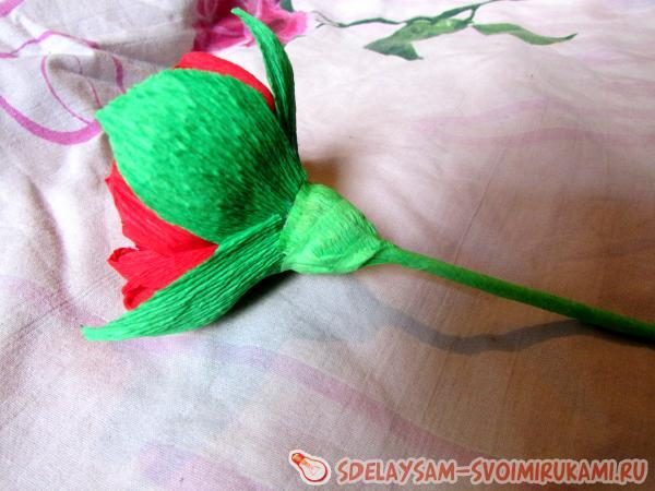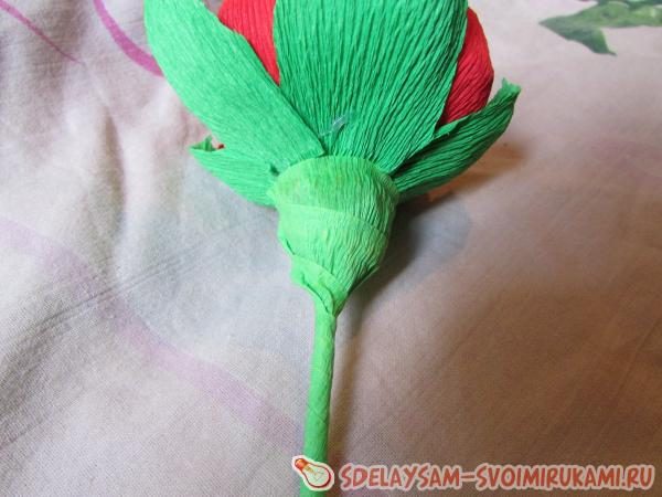 Теперь обработаем стебель цветка. Берем ножницы и срезаем ненужные части от лепестков внизу. Обрезаем так, чтобы было легче обклеивать стебель.