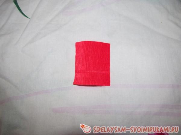 Для того чтобы начать работу с цветком, нужно сделать основу. Создадим серединку цветка. Возьмем гофрированную бумагу красного цвета, отрежем квадрат 4х4 см. В середине квадрата делаем углубление большими пальцами рук.