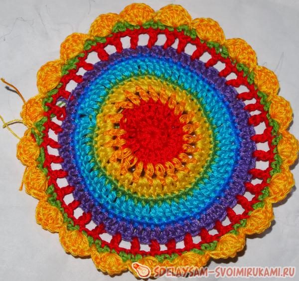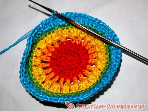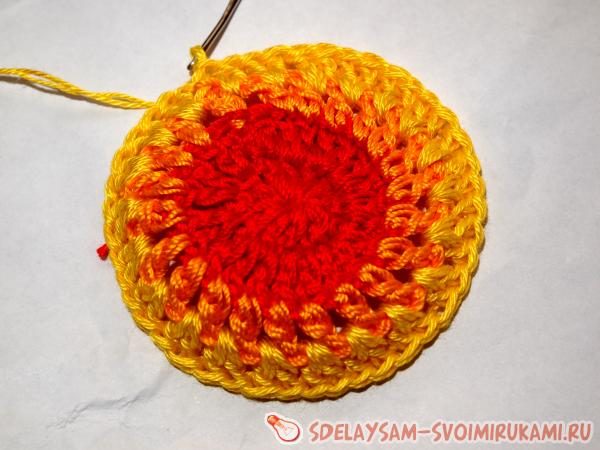 10 ряд: только СБН; 11 ряд: взять двойную нить — желтого и оранжевого цветов, связать 1СБН, пропустить 1 петлю, затем веер из 6 ССН, а через 1 петлю СБН.