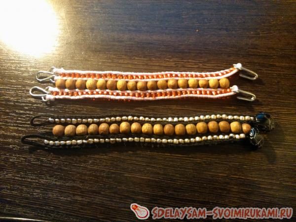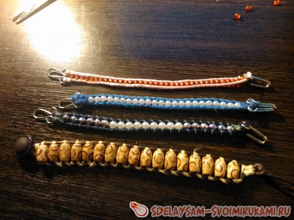 Перед работой обязательно проверяем: легко ли проходит иголка в бусинку. Нужно сделать так, чтобы при повторе действия (когда придется второй раз проталкивать иголку с ниткой) проблем не возникло. Нитка должна быть длинной и в цвет шнура. При примирении ниток контрастного оттенка, работа выглядит неаккуратной. Можно использовать разные виды застежек. Мне нравятся обычные крючки и пуговицы.