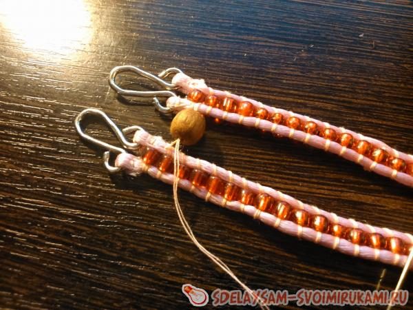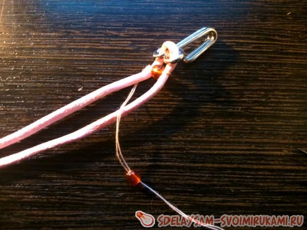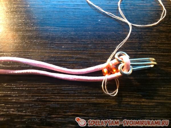 На иголку одеть бусину. Затем иголку с ниткой нужно пронести над правой частью шнура. Потом действие нужно повторить, но нитка должна уже пройти под ней. Затем иголку вонзить в эту же бусинку.