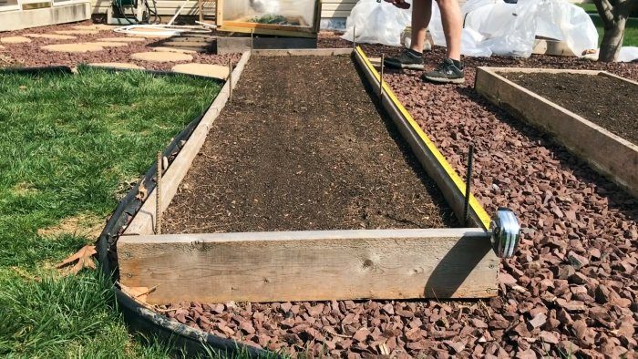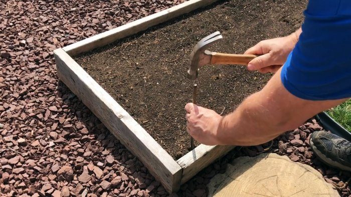 Забивку арматуры на заданную глубину начинаем с одного из внутренних углов ограждения парника и контролируем ее возвышение над верхом доски с помощью рулетки.