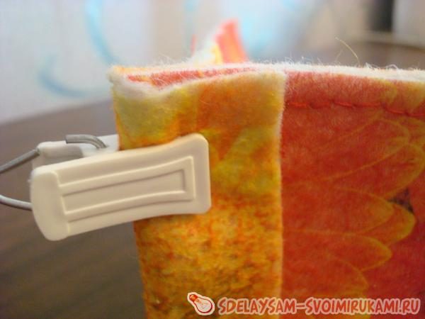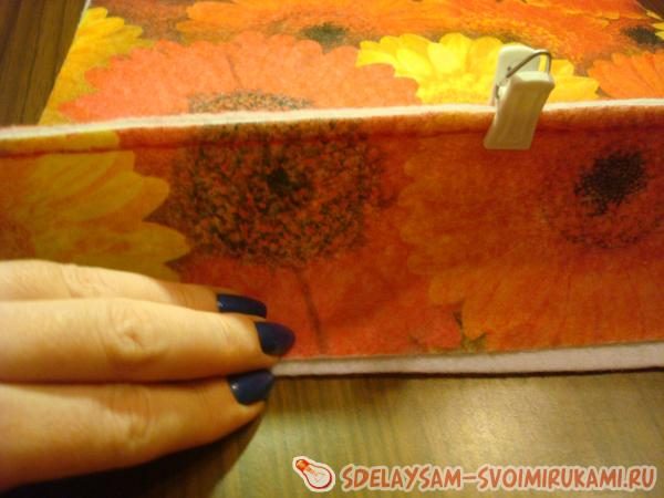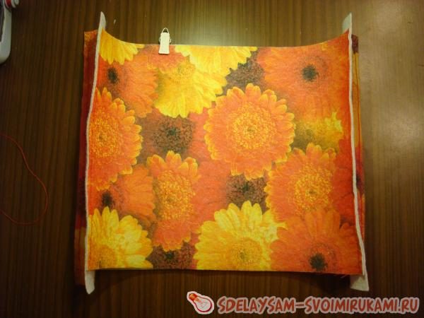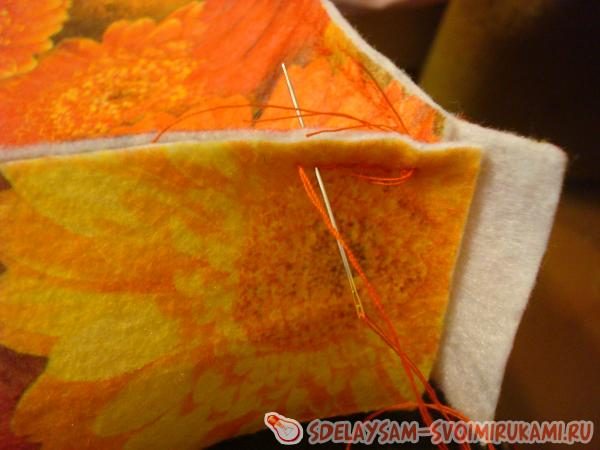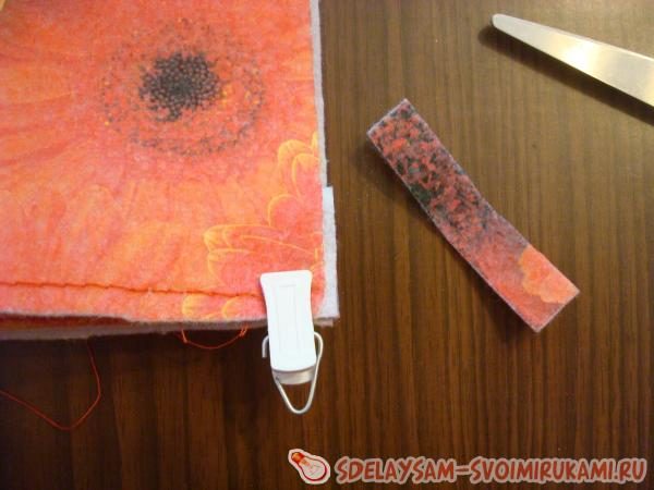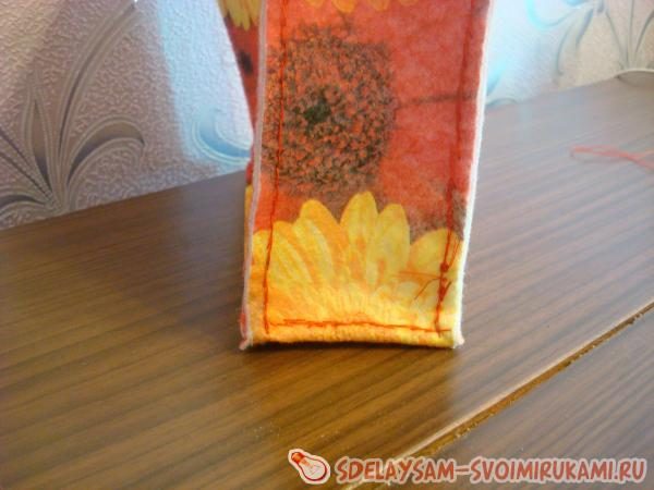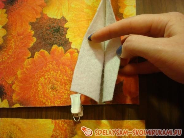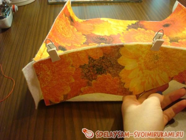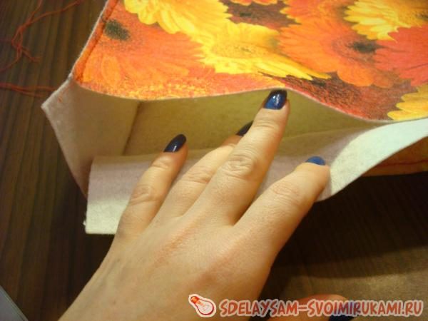 3. На этом этапе пришиваются боковые детали. Полоска прикладывается к материалу так, чтобы со всех сторон края сошлись как на фотографии.