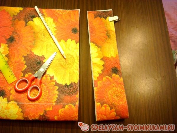 1. Нужно сложить материал вдвое так, чтобы совпали концы. Изнаночная сторона должна смотреть внутрь. Края для удобства лучше зафиксировать.