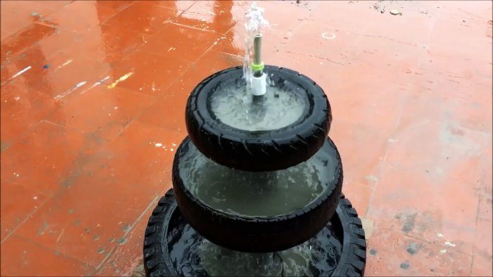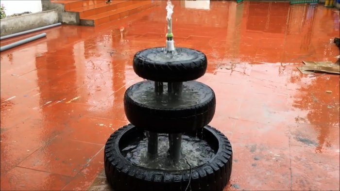 Трёхъярусный садовый фонтанчик из старых покрышек