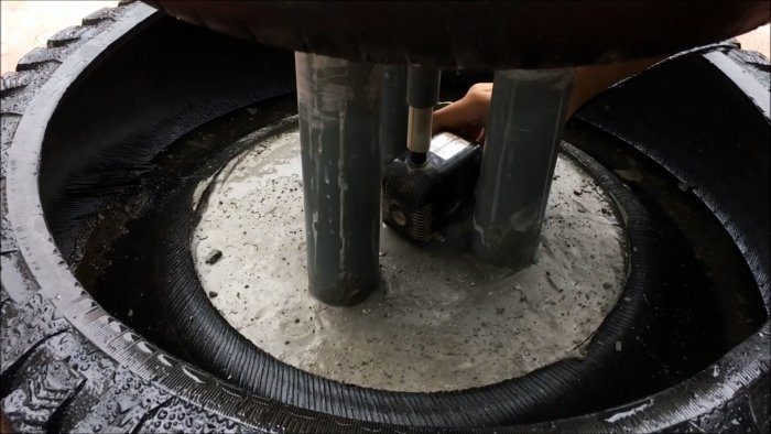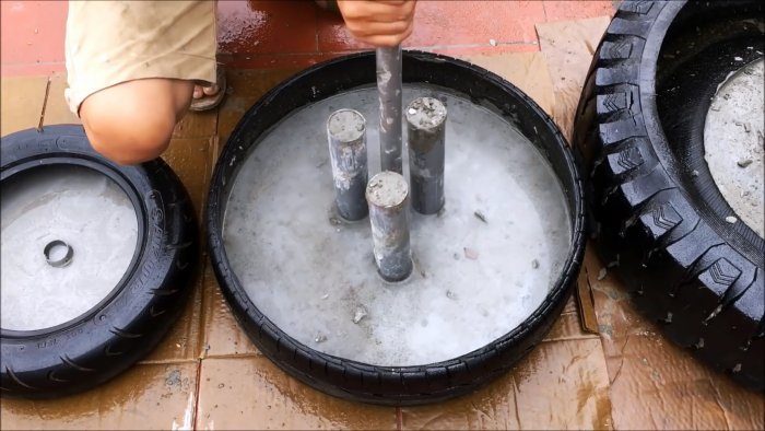 Последняя шина заливается бетоном уже без армирования. После разравнивания в центр ее дна насквозь вставляется трубка 32 мм. Затем шины оставляются до застывания цемента. Чтобы бетон не потрескался, после начального схватывания на него наливается немного воды.