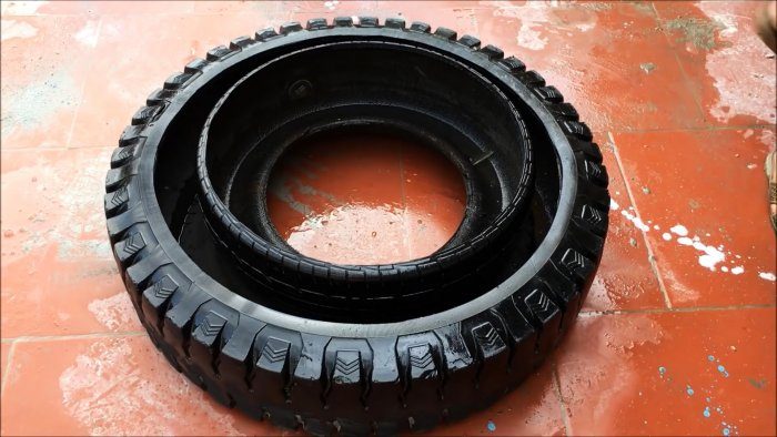 У покрышек среднего и большего размера нужно срезать боковину с одной стороны. Для этого их нужно промыть и смазать по линии реза маслом.