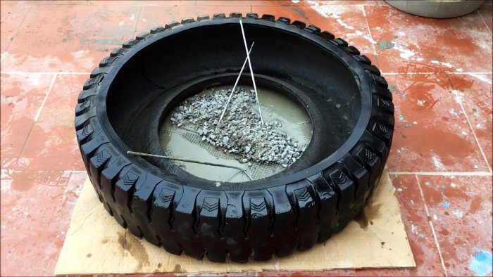 Большая шина укладывается ровно, под нее подстилается картон. Затем до середины ее бортика наливается бетон, в него утапливается сетка с арматурой.