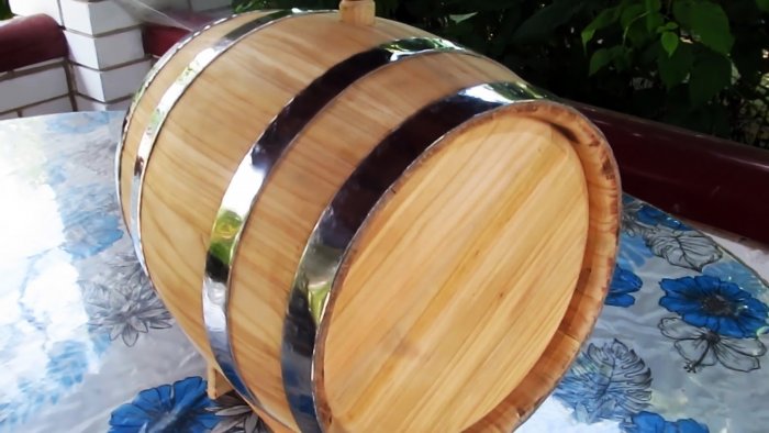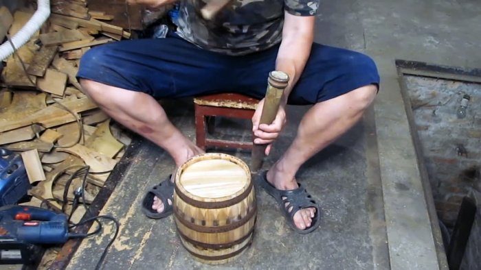 Выполняем подставку, ставим бочонок, сверху сверлим заливное отверстие диаметром 20-22 мм, шлифуем наждачкой и закрываем деревянной пробкой.