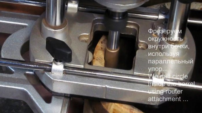 Делаем из многоугольника окружность по наружным краям бочки с помощью болгарки. Также фрезеруем окружность внутри бочки, используя параллельный упор.