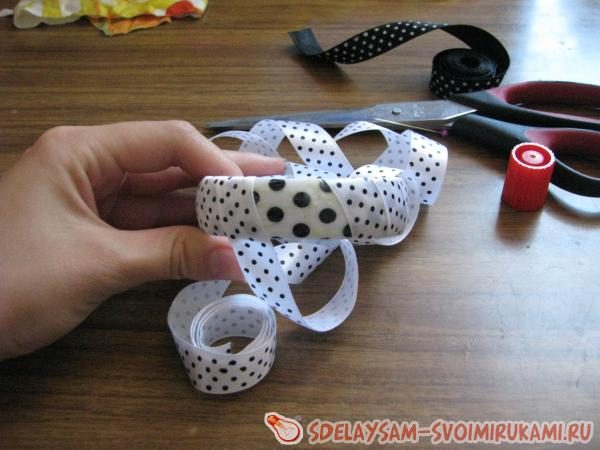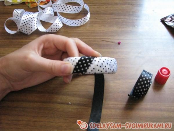 Первый браслет подойдёт для официального костюма, делового образа и офисного стиля. Для него понадобиться широкий каркас, клей, ножницы, атласная лента. Мы берём ленту в мелкий горох, так как именно он является трендом из года в год. Классические чёрный и белый цвета позволяют выгодно играть на контрастах! Для начала смазываем 2-3 см каркаса клеем и, хорошо натягивая ленту, закрепляем её по кругу под углом приблизительно 30 градусов.