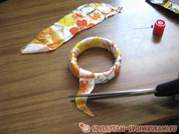 Отрезаем длинный прямоугольный лоскуток и далее, следуя такой же технике, заворачиваем под наклоном по кругу всего браслета. Здесь можно не слишком натягивать ткань, делая естественные складки, которые придадут больше объёма.