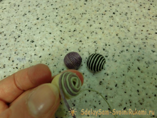 В третьей, как и в первой скомпонуйте два цвета (сиреневый + серый). Следующая — фиолетового цвета. Далее скомбинируйте серый шнур с синим, по краю можно пустить коричневый. Словом вариаций может быть много. Сделайте всего, таким образом, семь бусин.