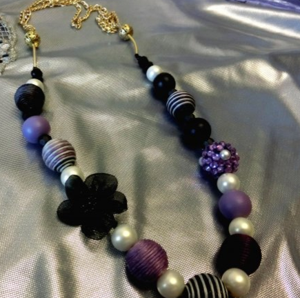 Этот вариант украшения можно считать неброским, спокойным, подчеркивающим утонченный вкус их обладателя. Сама текстура и гамма бус указывает на натуру серьезную, но романтическую, поскольку сбоку мы пришьем маленький черный цветочек. Также одну бусину декорируем сиреневыми стразами чтобы добавить некий акцент — яркое пятно в аксессуар.