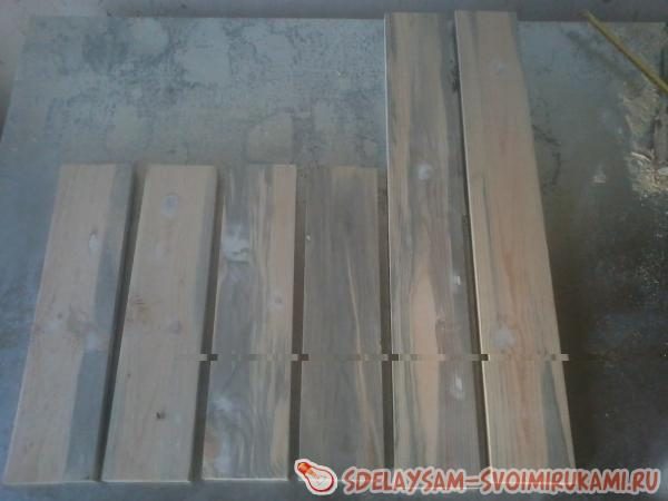 Размеры условные и могут меняться в зависимости от предполагаемого места, где будет находиться полочка. Ширина заготовок также выбирается произвольно, исходя из собственных потребностей и наличия той или иной доски. В данном случае ширина составляет 10см.