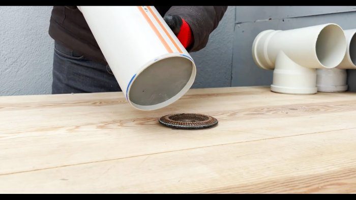 Устанавливаем на строительном фене режим 630 градусов Цельсия и осторожно, соблюдая дистанцию, разогреваем конец патрубка до размягчения (но не потери формы!) и вставляем пластиковую заглушку до упора.