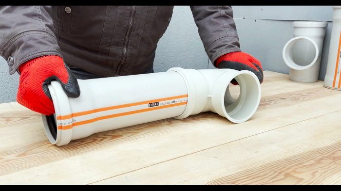 В раструб тройника, убедившись в наличии уплотнительного кольца, вставляем патрубок без заглушки. Патрубок с заглушкой из пластикового листа раструбом надеваем на другой конец первого тройника.