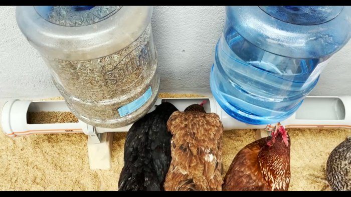 Сделав несложную конструкцию из патрубков и тройников ПВХ, а также ПЭТ-бутылей на 20 литров, и задав один раз в день курам корм и воду, можно больше не беспокоиться до 3-7 дней.