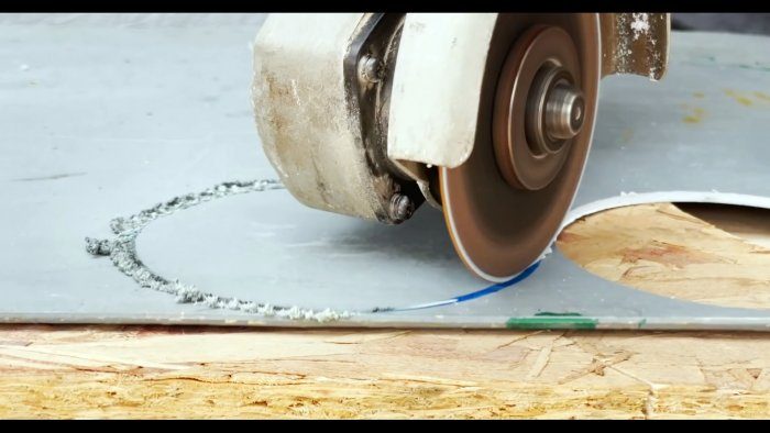 Обработав кромки, укладываем заглушку на диск болгарки и давим на патрубок. В результате заглушка оказывается в патрубке на некотором расстоянии от торца.