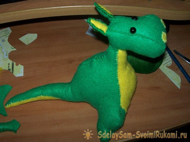 Вывернуть тело дракончика на лицевую сторону и наполнить его холлофайбером.