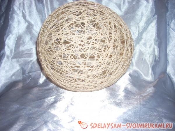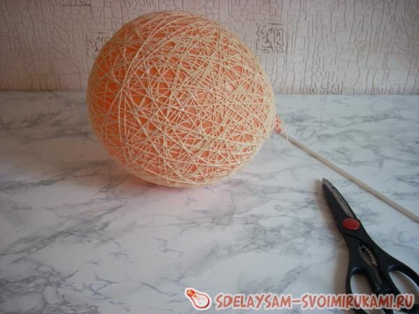 4. Наматываем нужное количество слоев (оно зависит от того, насколько непрозрачным вы хотите сделать поверхность плафона), закрепляем нитку у основания шара и даем изделию хорошо просохнуть.