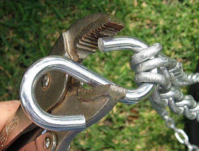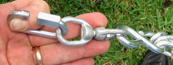 Делаем кольцо вокруг ветки и соединяем оба конца цепи соединением с резьбой — винтовым карабином.