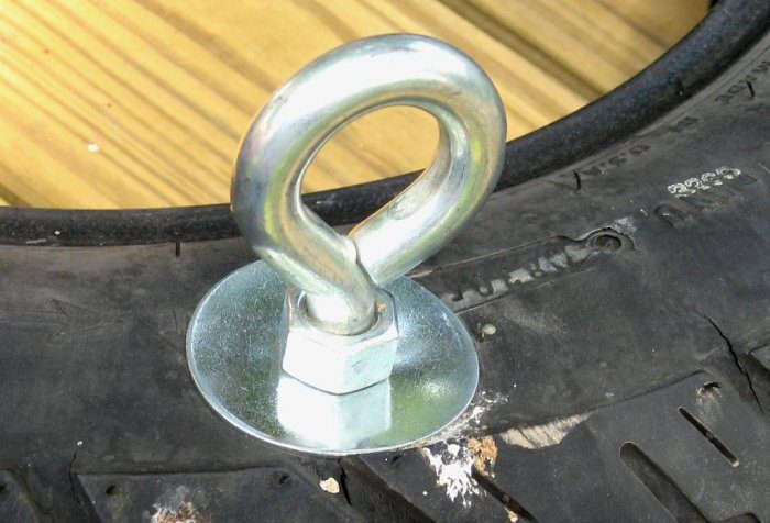 Затем карабин. Он в дальнейшем будет нужен для того, чтобы в любой момент можно было снять или повесить качели.