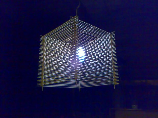 Этот каркас склеен из тех же шпажек, обрезанных на 2 сантиметра, чтобы боковые палочки выпирали, задавая необычную форму светильника.