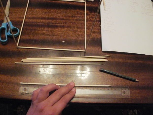 Итак, возьмем шпажки и склеим ровный квадратный каркас. Он задает всю форму светильника, поэтому его нужно склеить особо ровно.Этот каркас склеен из тех же шпажек, обрезанных на 2 сантиметра, чтобы боковые палочки выпирали, задавая необычную форму светильника.