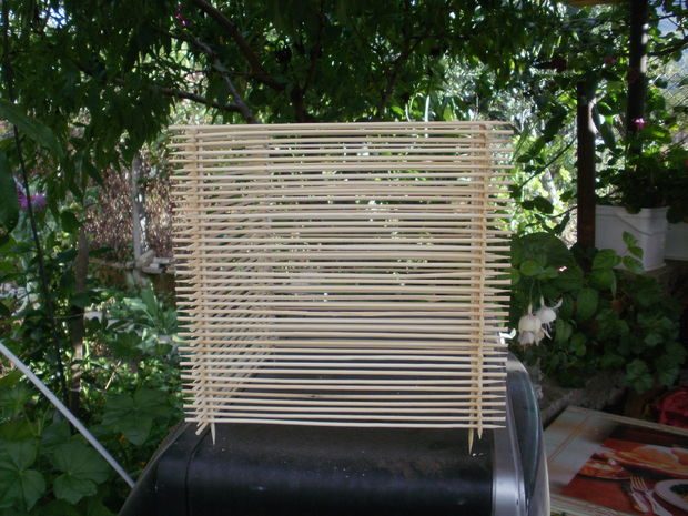 После высыхания каркаса, приступаем к изготовлению стенок. Для этого размечаем каждую шпажку карандашом, обозначая сантиметровый отступ с каждой стороны.