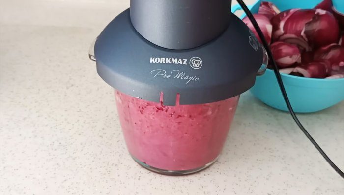Заполняем емкость измельчителя кусочками лука доверху и также посыпаем 5-ю граммами соли.
