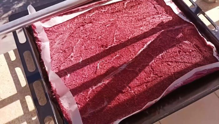Таким способом перерабатываем всю массу лука и, если ее оказалось много, то подготовленную массу распределяем по нескольким противням. Полученную луковую массу сушим на солнце в течение 2-х дней.
