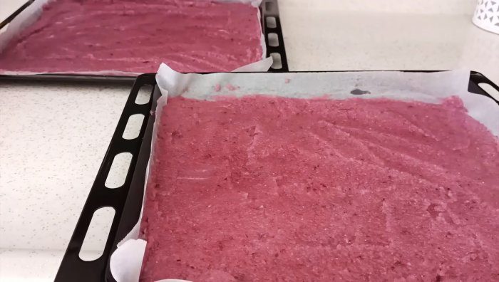 Закрываем емкость измельчителя крышкой и включаем прибор для превращения ломтиков лука в гомогенное пюре. Затем полученную массу выкладываем в противень, прикрытый жиронепроницаемой бумагой, и распределяем равномерно пищевой лопаточкой по всей поверхности противня нетолстым слоем.
